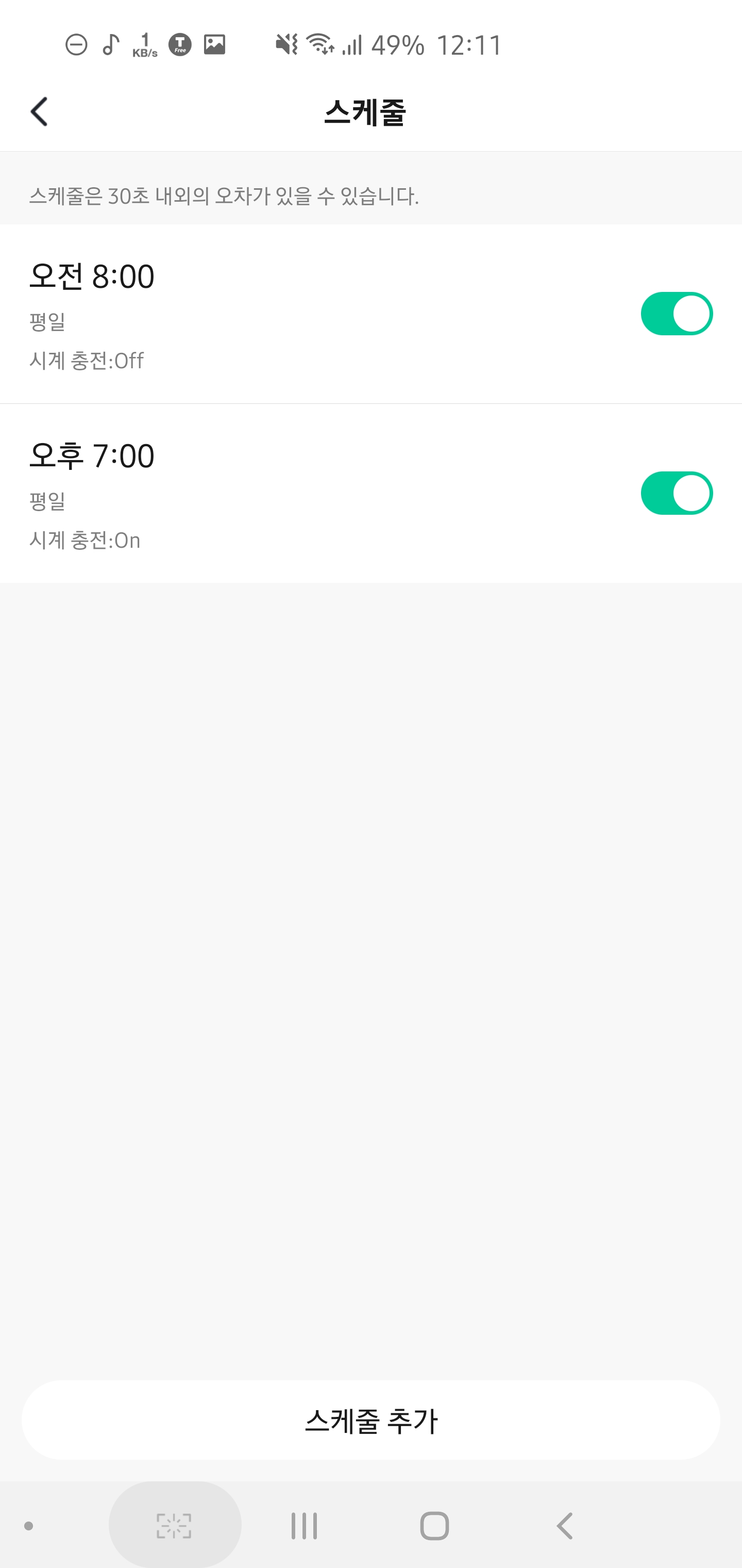 본인은 스마트와치를 사용 중인데 아침에 출근을 8시에 한다고 가정 하고 오후 7시 퇴근을 가정하여 충전기의 전원 차단 스케쥴을 줬다.
