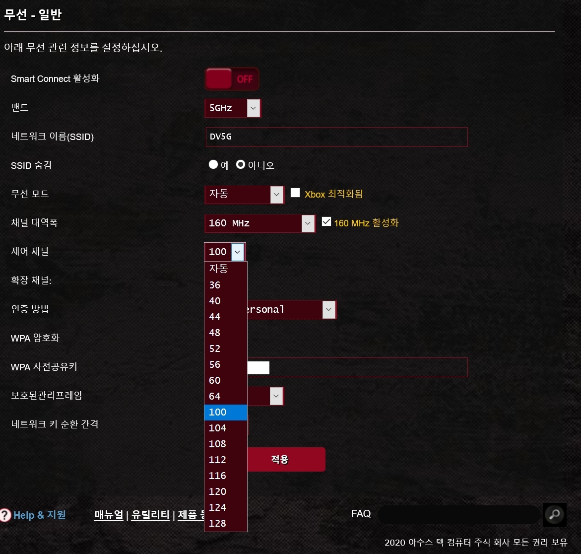 5. 공유기 접속 드럽게 안됨 5Ghz 160Mhz 설정시 뭔가 PC의 AC9260 카드에서는 접속이 잘 안되는 현상이 발생함