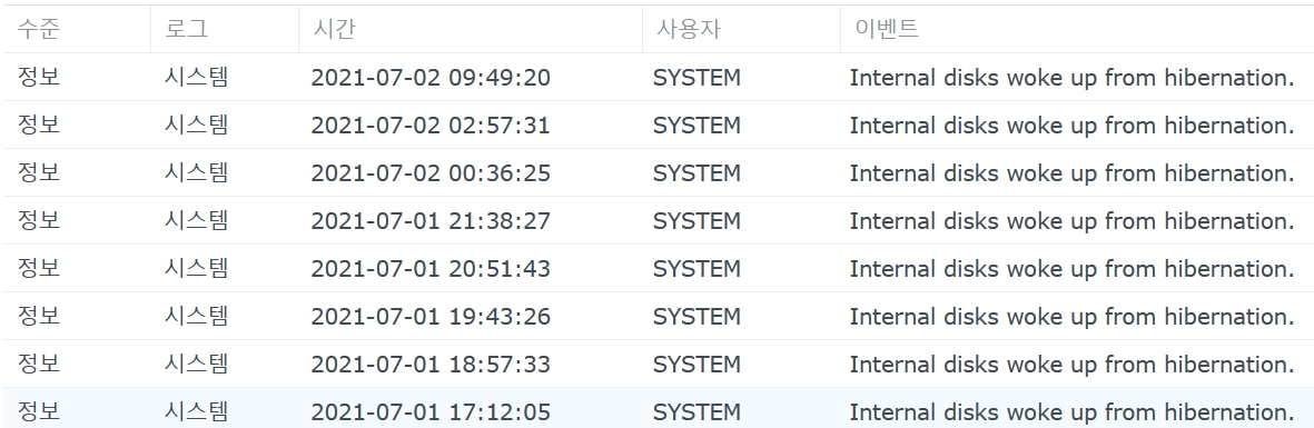 시놀로지 NAS 절전모드 해제 원인 찾기 2021.04.20