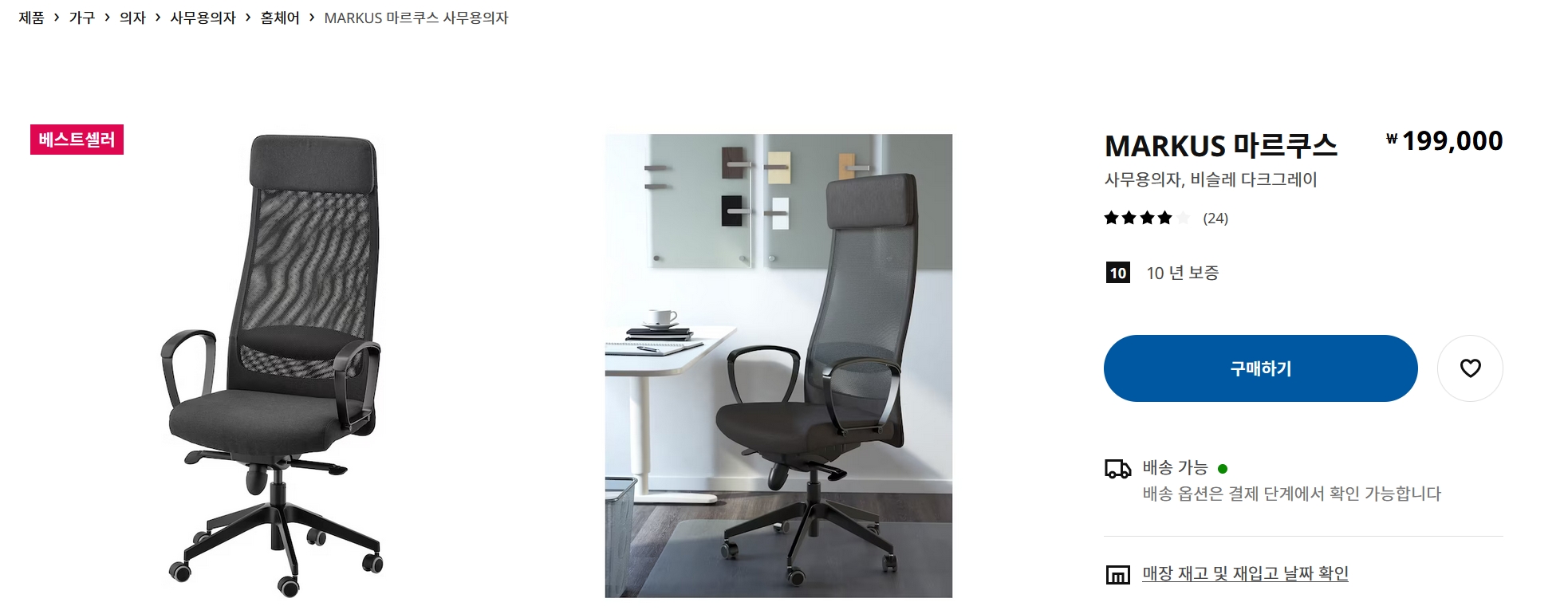 본인은 2018년 8월 경 광명 이케아에서 마르쿠스 의자를 구매하여 사용 중