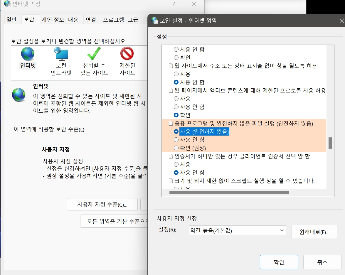 인터넷 -> 사용자 지정 수준 -> 응용 프로그램 및 안전하지 않은 파일 실행