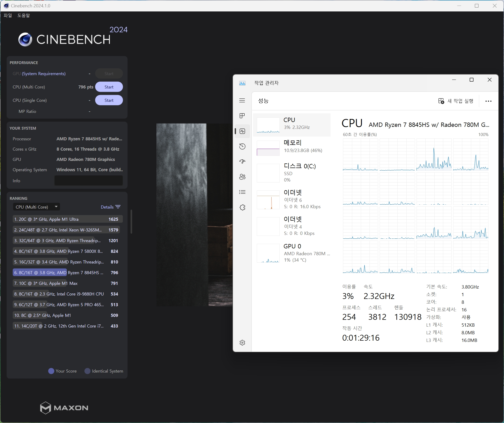 아이유8K 재생 하면서 시네벤치2024 같이 돌리니 메모리 56.3도 CPU 58도 전기는 63W 소모 됨