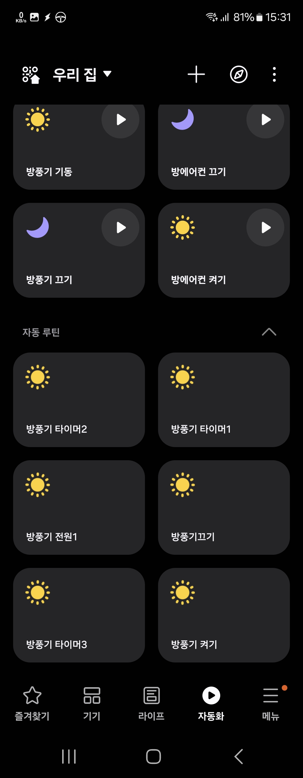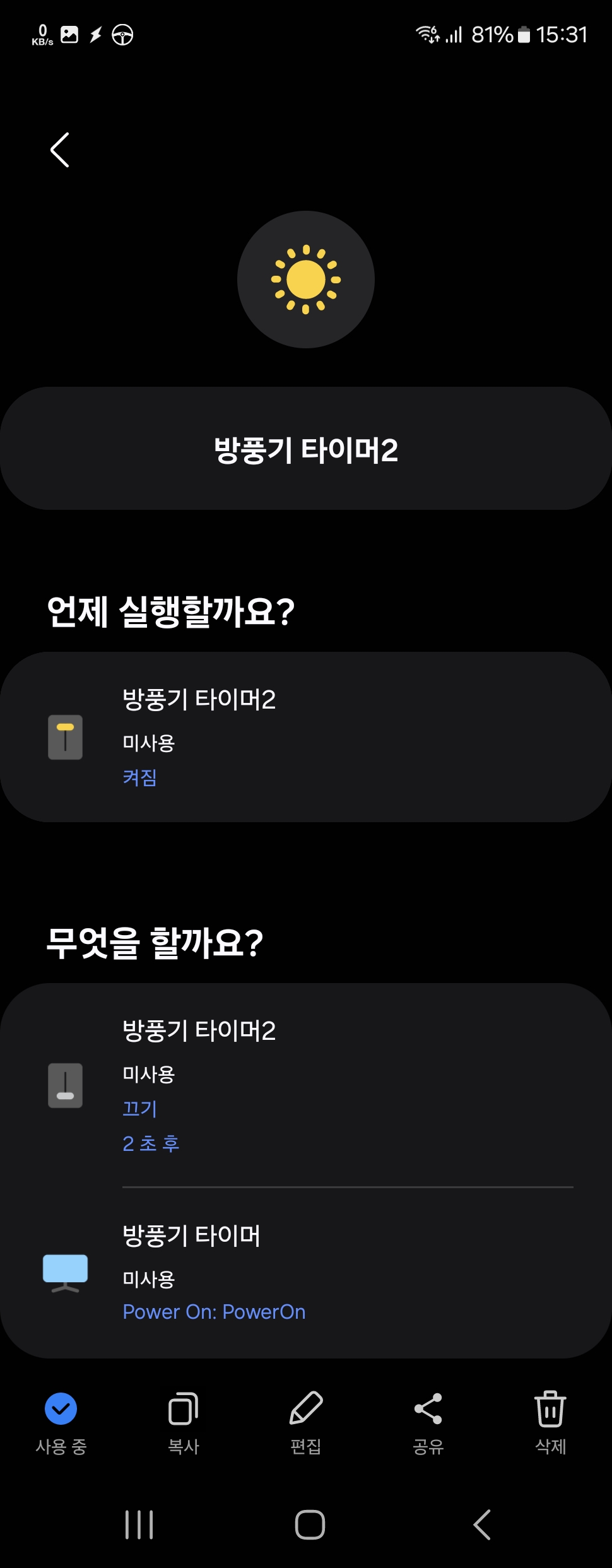 그렇게 전원 과 타이머1,2,3 각각 가상 스위치 안에 자동 루틴을 만들어 놓고