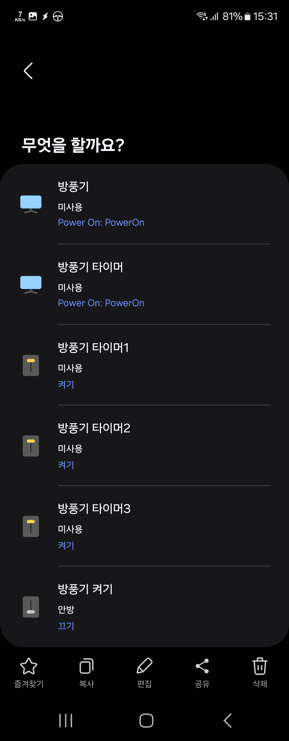 구글 홈은 같은 버튼 여러번 누를 수 있는데 스싱은 하나의 루틴에서 같은 기기 2번 제어 못하게 막아 놓은게 이해가 안간다... 처음에 아무 생각 없이 어떻게 동작하나 싶어서 기본 루틴 그대로 버튼 눌렀다가 2분 동안 선풍기 전원 on 버튼 무한 루프 걸렸던거 생각하면...ㅂㄷㅂㄷ...