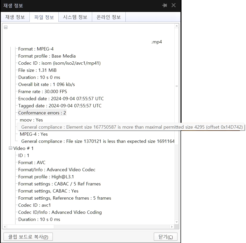 영상은 avc 코덱을 사용한 h.264 코덱 이지만 영상 자체에 에러가 있어서 재생이 안된다.