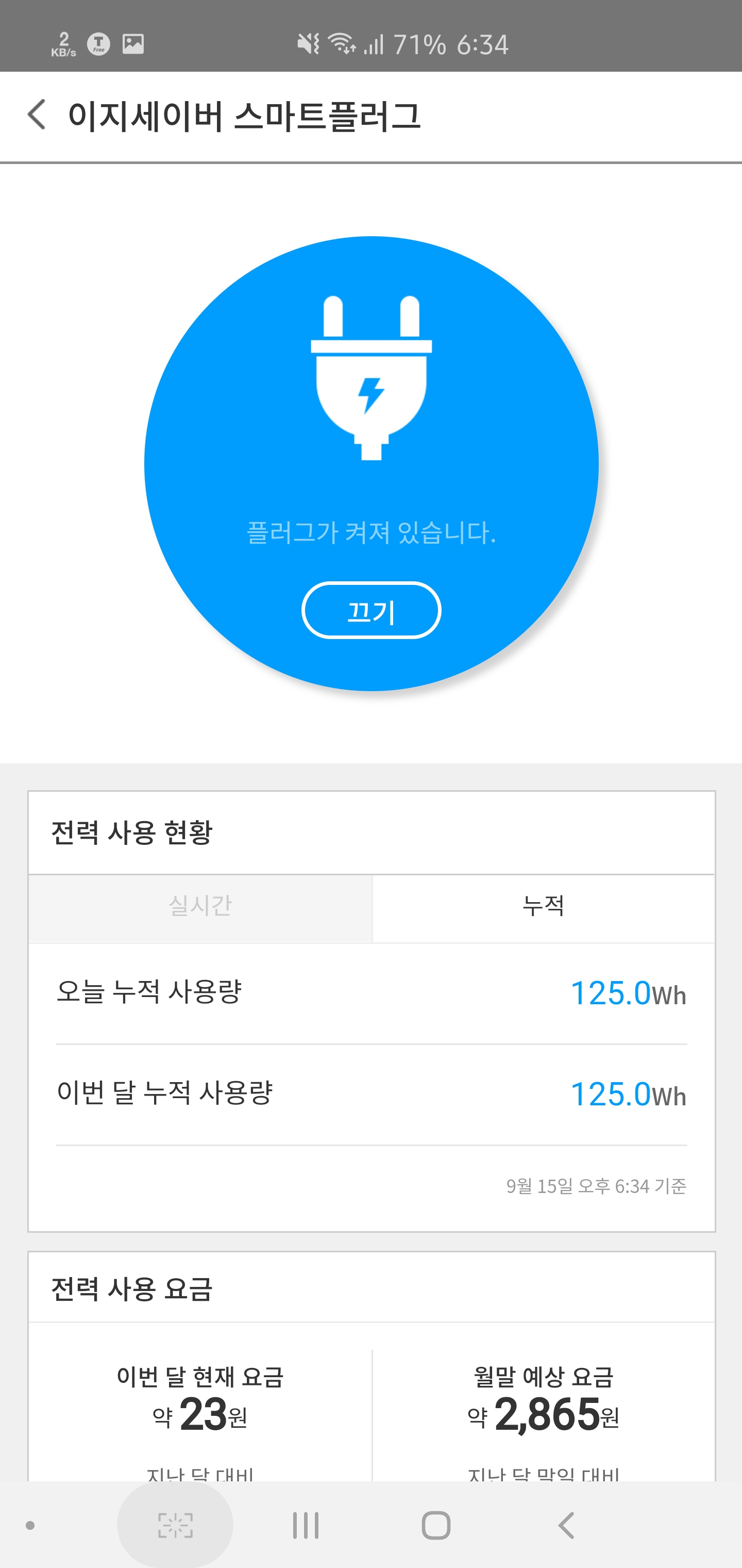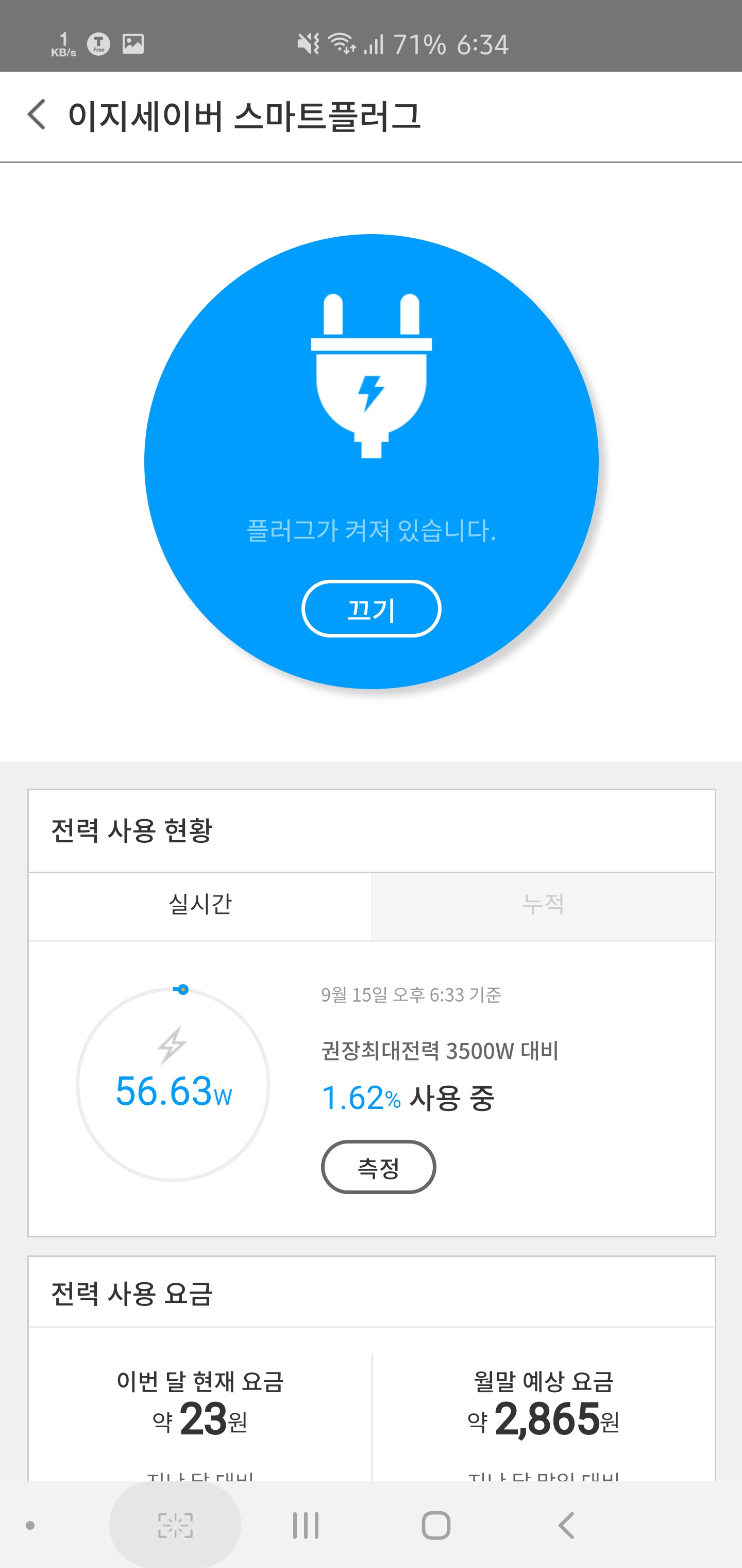 실시간 사용량의 측정을 누르면 현재 사용량이 나옴